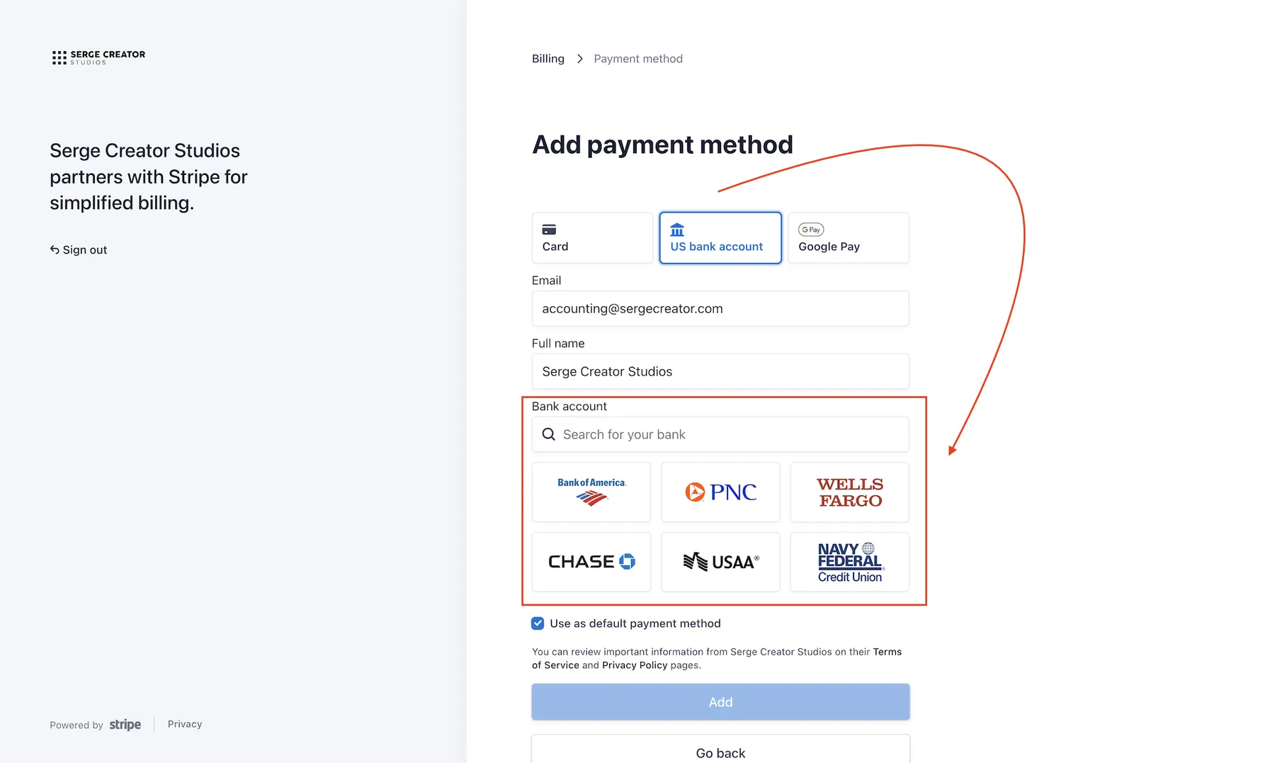 3. Please add the payment method you listed in the Payment Authorization Form to your account. ​