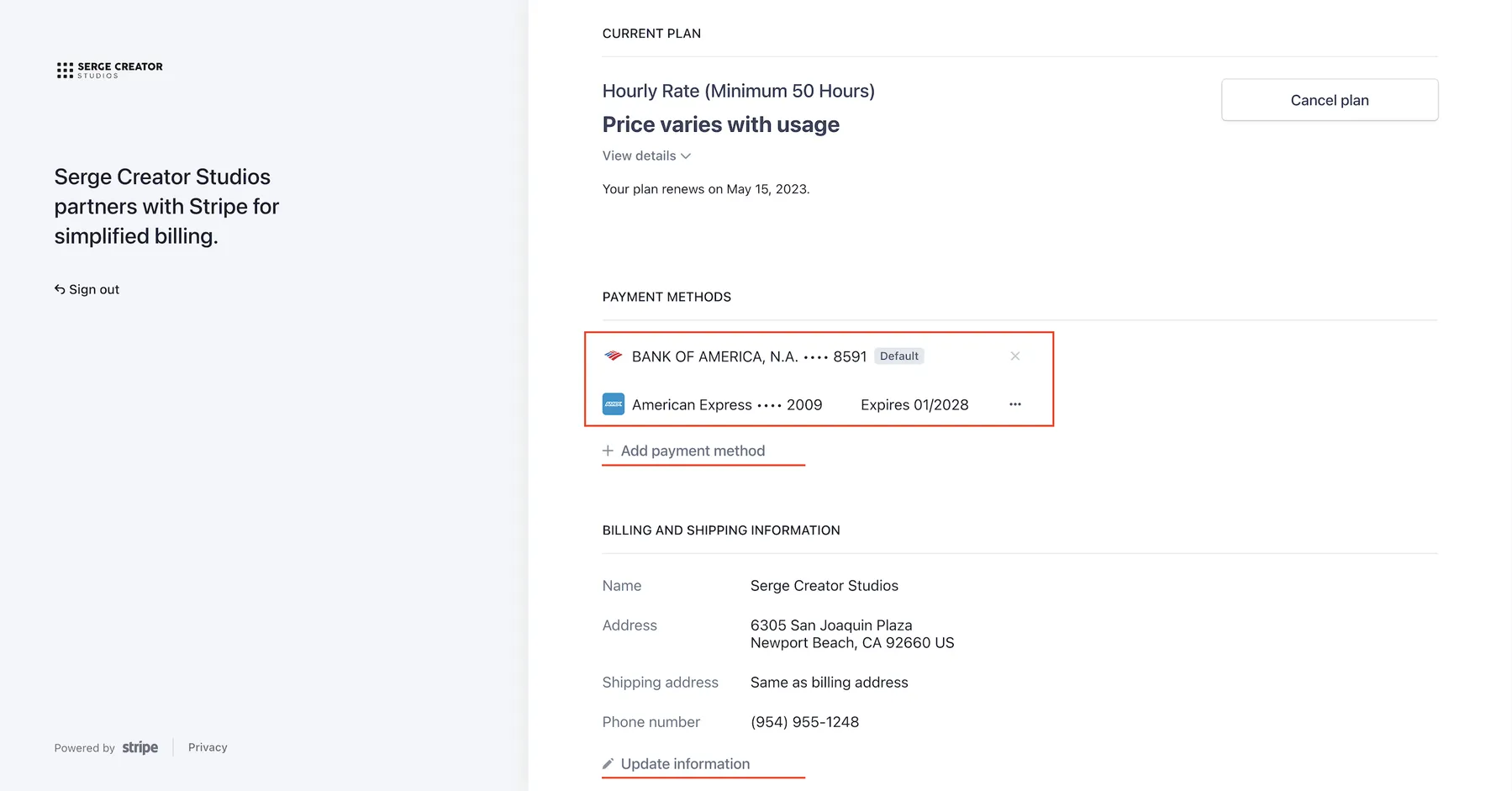 Our customer portal, which [stripe.com](https://stripe.com) powers, offers a convenient platform to manage your payment information, such as updating your billing information, viewing invoices and payments, and managing your current subscriptions or payment plans. You may also add or change your payment information at any time for your convenience.